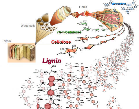 Dans un deuxième temps, elle a abordé les différents processus chimiques, biologiques et thermochimiques mis en œuvre pour transformer la biomasse végétale en produits utiles, en citant plusieurs exemples de la vie quotidienne. La vanilline, majoritairement issue du pétrole, peut également être synthétisée à partir de la lignine.