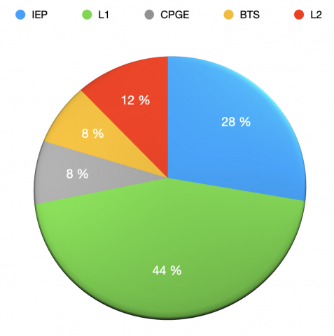 - 30% ont rejoint une L2 de l'UGA (Université Grenoble-Alpes) dans le cadre de la convention qui donne l'équivalent de L1 à une année de CLPES (Licences Sciences Humaines Appliquées, Langue Étrangères Appliquées ou Économie-Gestion),